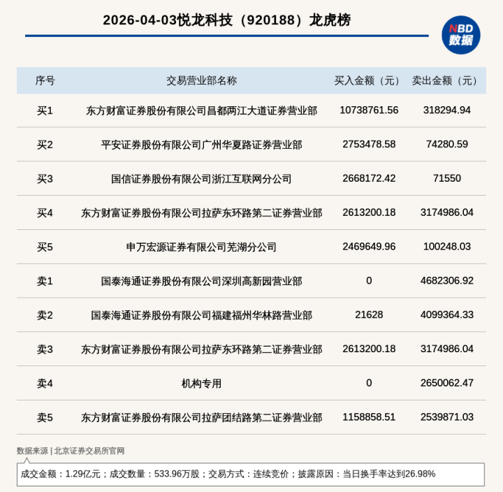 每经讯,2026年4月3日,北交所上市公司悦龙科技(920188,收盘价:23.85元)登上龙虎榜,往来样子是磋议竞价,开云app下载表示原因是当日换手率达到26.98%,成交数目533.96万股,成交金额1.29亿元。买一席位为东方资产证券股份有限公司昌王人两江正途证券贸易部,买入1073.88万元;卖一席位为国泰海通证券股份有限公司深圳高新园贸易部,卖出468.23万元。