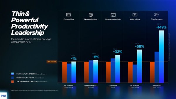 在竞品对标方面,开云体育官网Intel将其与AMD锐龙AI 9 HX PRO 375进行对比,以酷睿Ultra X7 358H为例,像片裁剪性能最初1%,Web欺诈性能最初8%,通用办公性能最初33%,视频裁剪性能最初58%,AI性能最初149%。