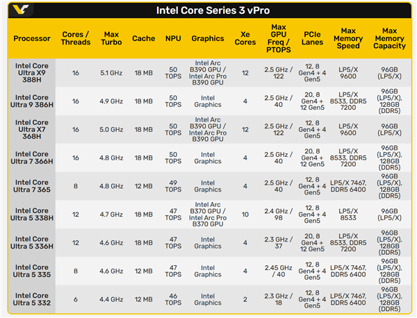 部分高端型号搭配Intel Arc B390或Arc Pro B390显卡(12个Xe中枢),中低端型号则配备4核或2核的Intel集成显卡。