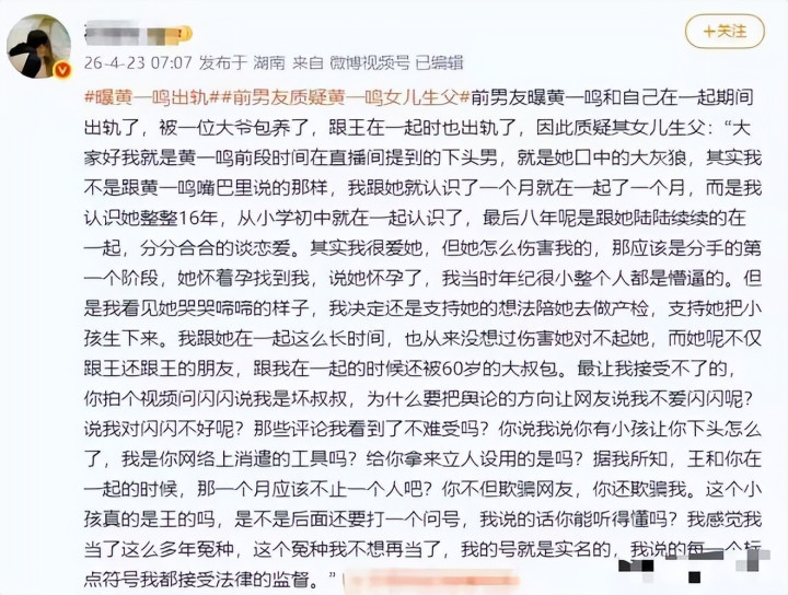 前男友还控诉,他之是以忍到当今才爆发,是因为黄一鸣作念得太绝。仳离后,黄一鸣不仅在网上长期抹黑他,把他描述成不负背负的渣男,更过分的是,她尽然在直播时教导年幼的男儿叫他 “坏叔叔”、“狼叔叔”,率领粉丝网暴他,让他承受了庞杂的会聚暴力和思想包袱。此次实名爆料,他亦然被逼到死路,才决定以死相拼,并防卫声明,我方所说的每一句话都愿承担总共法律背负。