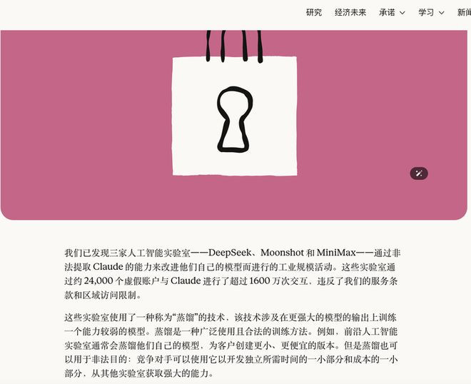 在 Dario Amodei 与好意思防长会面确当日,Anthropic 官方博客须臾发起了对它堪比堂吉诃德的风车一般的遐想敌——中国大言语模子公司的指控。
