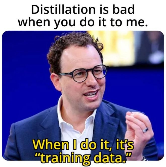 一位 X 用户制作了广为流传的 meme 图:“当你作念的时期叫蒸馏,当咱们作念的时期叫考试”(Distillation when you do it. Training when we do it),提纲契领 Anthropic 操弄的“术语政事” 双标。