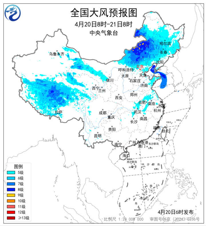 展望,4月20日08时至21日08时,新疆沿天平地区和南疆盆地、西藏大部、青海大部、甘肃河西、内蒙古中东部、东北地区大部、河北北部、北京、天津、山东半岛、苏皖大部、湖北东部等地部分地区有5~7级风,阵风8~9级,其中新疆东部山口、西藏北部、内蒙古中部局地有8~9级风,阵风10级以上;渤海、渤海海峡、黄海北部海域、黄海中西部和西南部部分海域将有7~8级、阵风9级的大风。