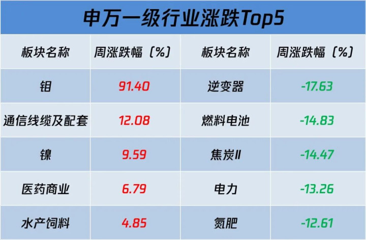 本周钼、通讯线缆及配套、镍等行业指数进展亮眼;逆变器、燃料电板、焦炭等行业指数进展欠安。