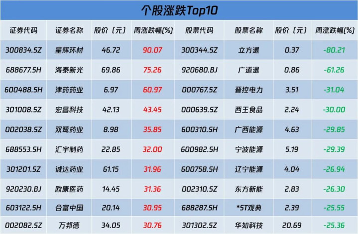 剔除新股及次新股后,星辉环材大涨90.07%,成为本周“最牛股”。正本作念塑料的它,因为无东谈主驾驶独角兽“九识智能”拟斥资近12亿入股,径直被资金当成了AI意见股爆炒。此股周二至周四(3.31-4.2)运动3个20CM涨停,3天累计涨幅高达72.79%,市值暴增。周五天然连板闭幕,但盘中照旧创下52.19元历史新高,全天在高位剧烈轰动,最终收涨约7.4%,周线收出一根擎天柱。